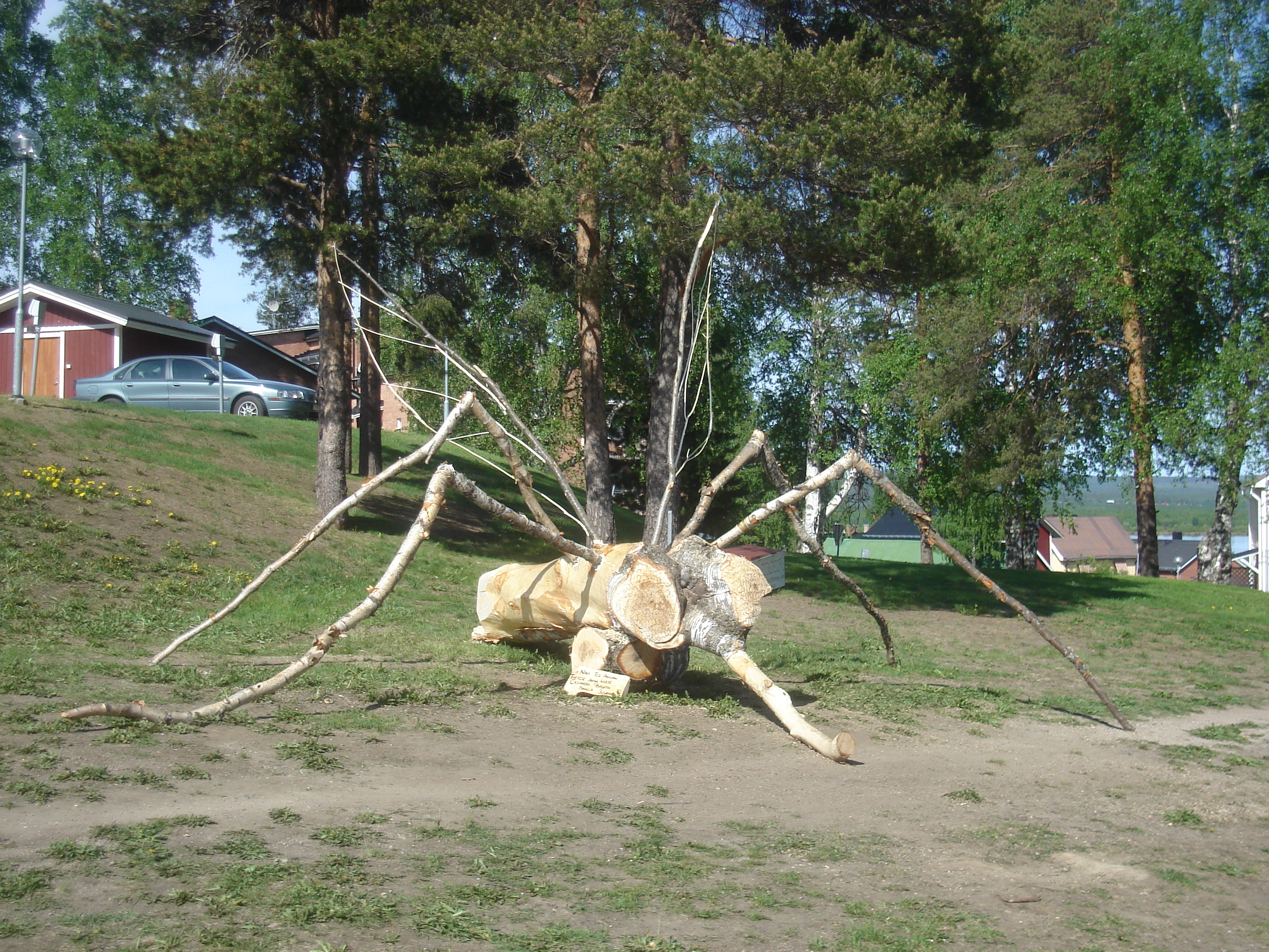 Our starting point was Övertorneå municipality's large mound of felled birches. In it lay an elephant and that became the basis of our work. The elephant eventually turned into a mosquito. Like a tribute to the areas many millions of mosquitos. In collaboration with Lars Lundqvist and Region Norrbotten and Övertorneå municipality 2007